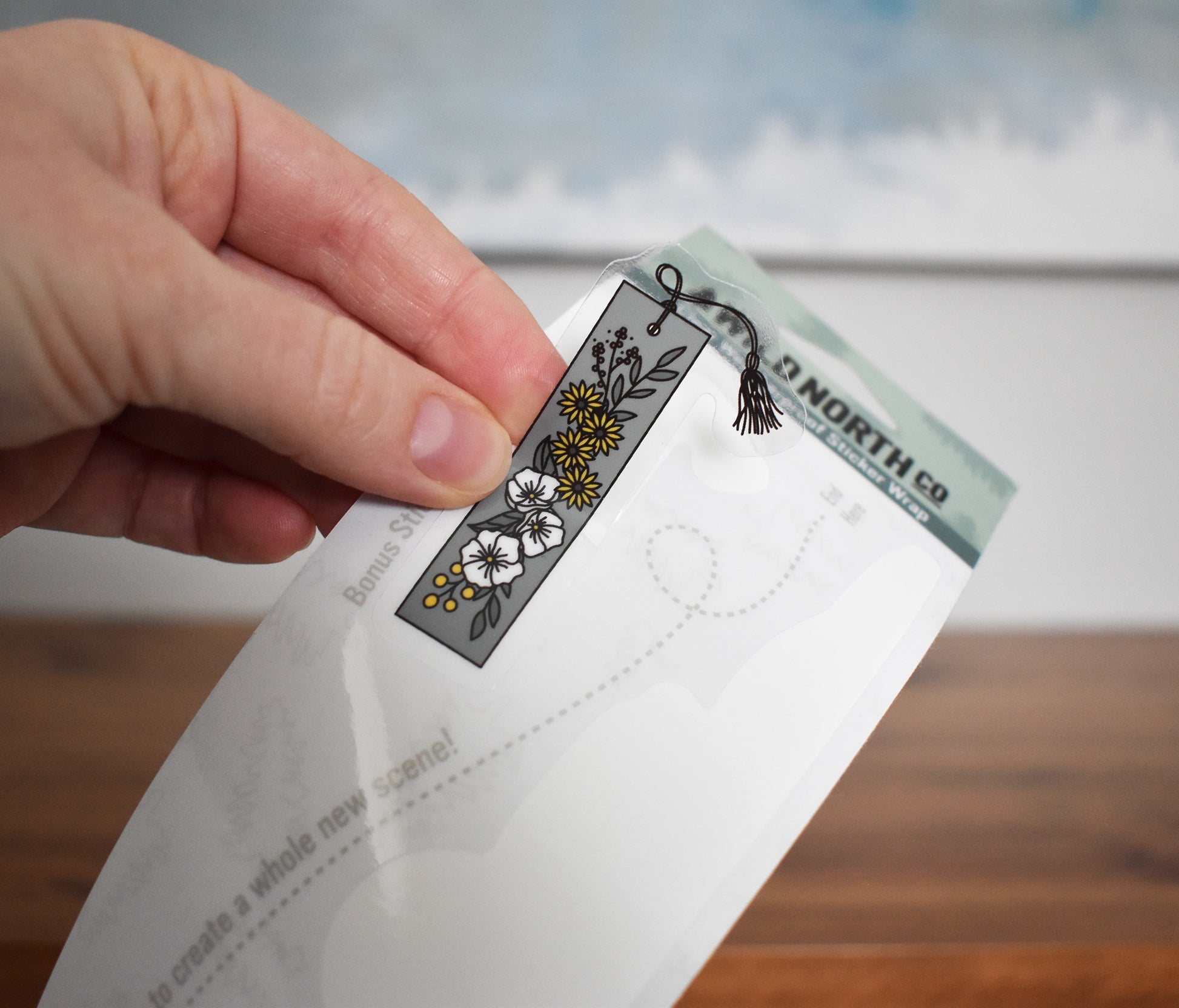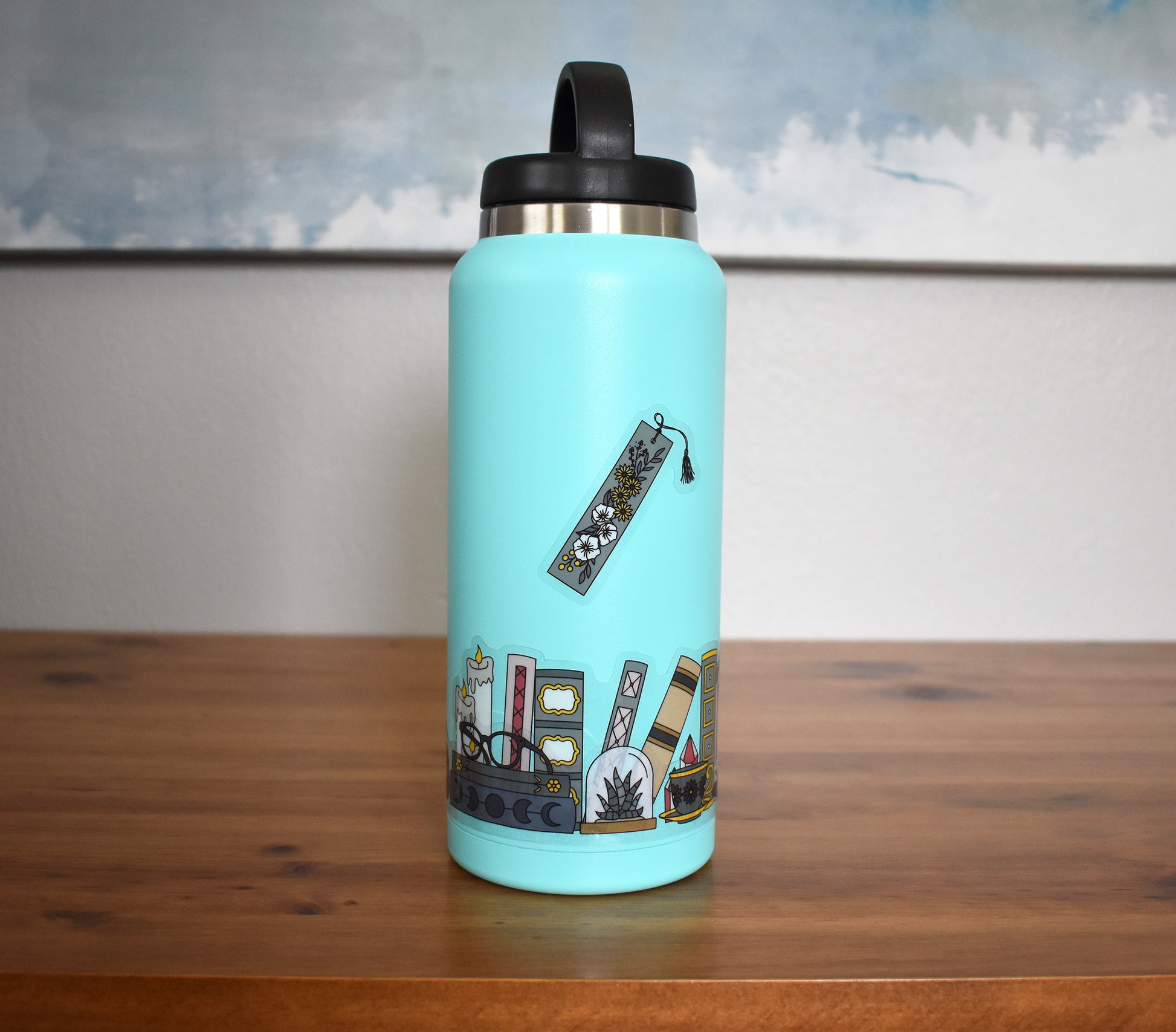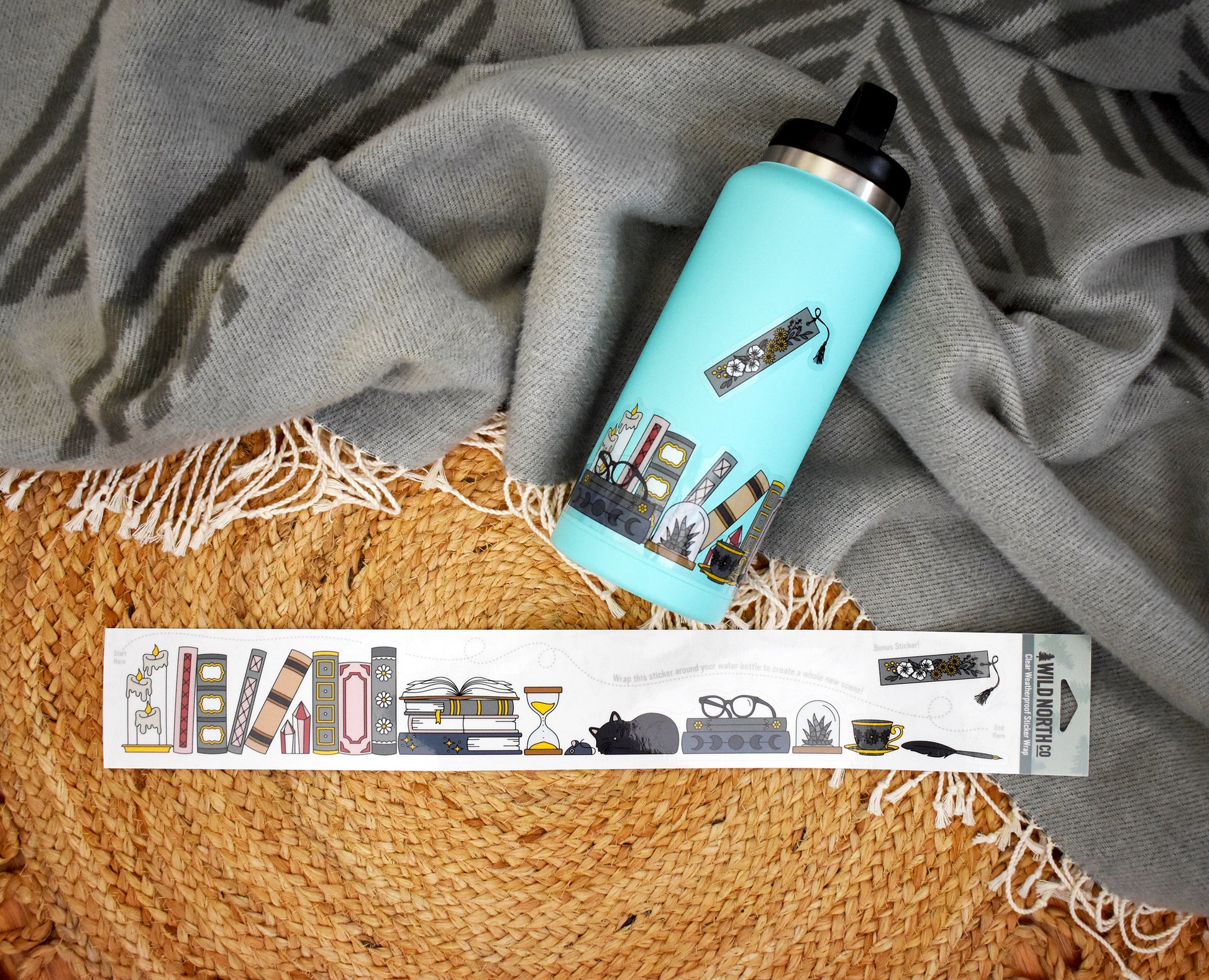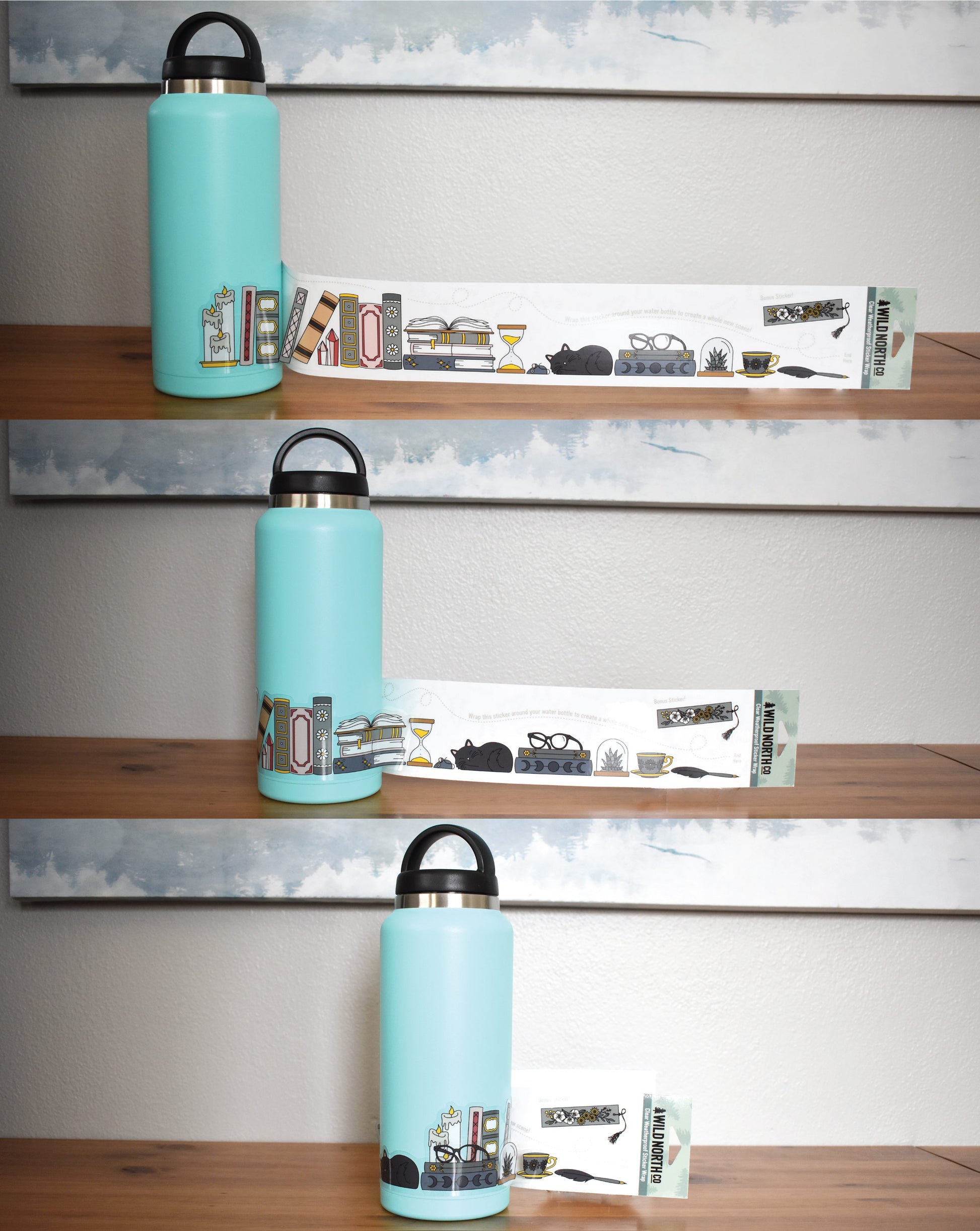 This extra long clear book sticker was designed to wrap the entire way around any size bottle up to 1/2 gallon! As you place the sticker around the bottle it will overlap and create an epic bookshelf scene, complete with a bonus bookmark sticker!
