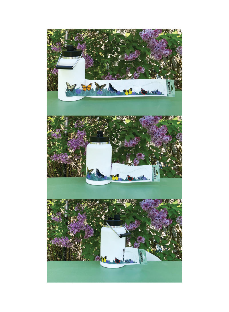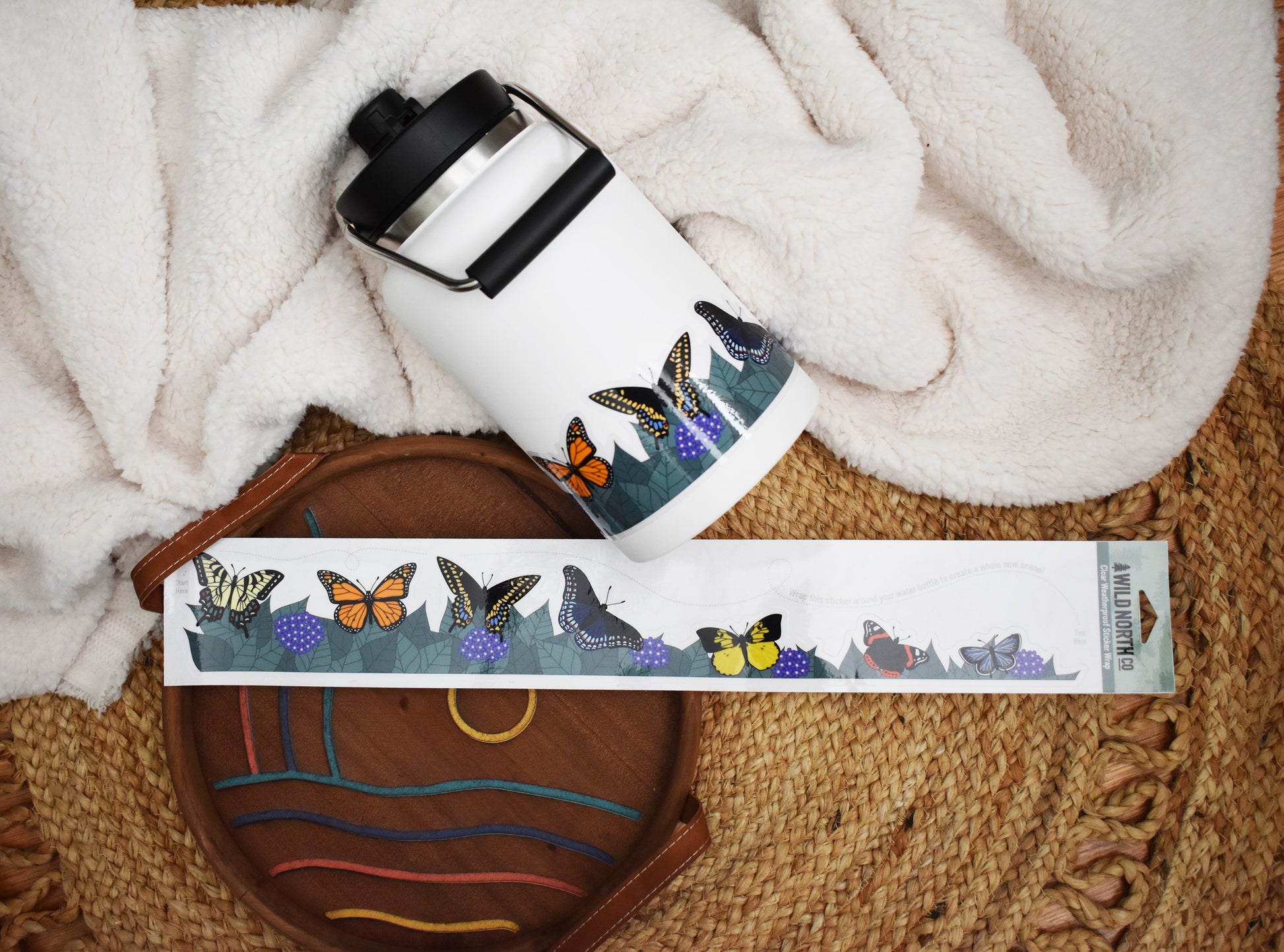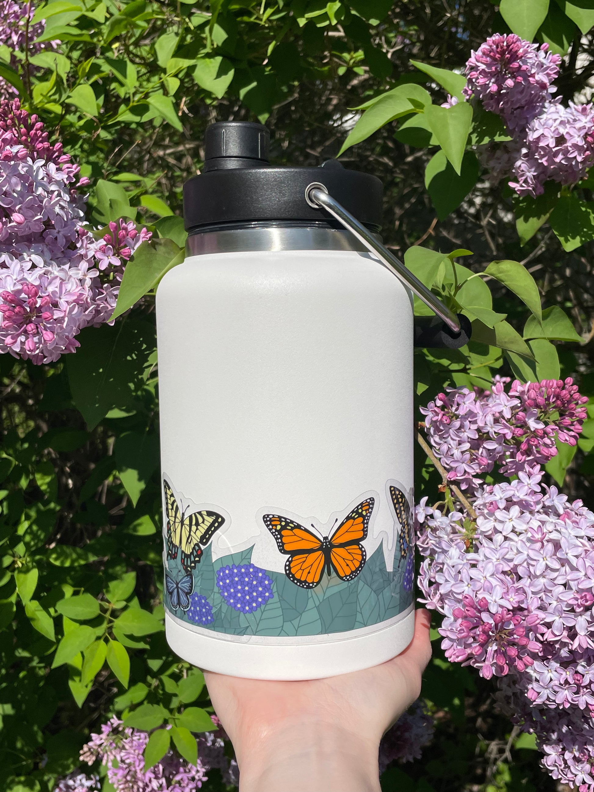 This butterfly garden sticker was designed to wrap the entire way around any size bottle up to 1/2 gallon! As you place the sticker around the bottle it will overlap and create a beautiful garden scene filled with butterflies!