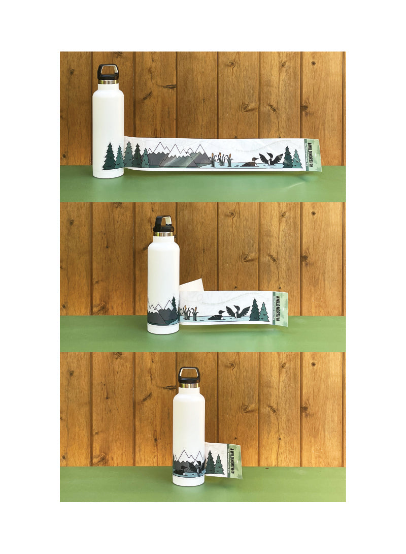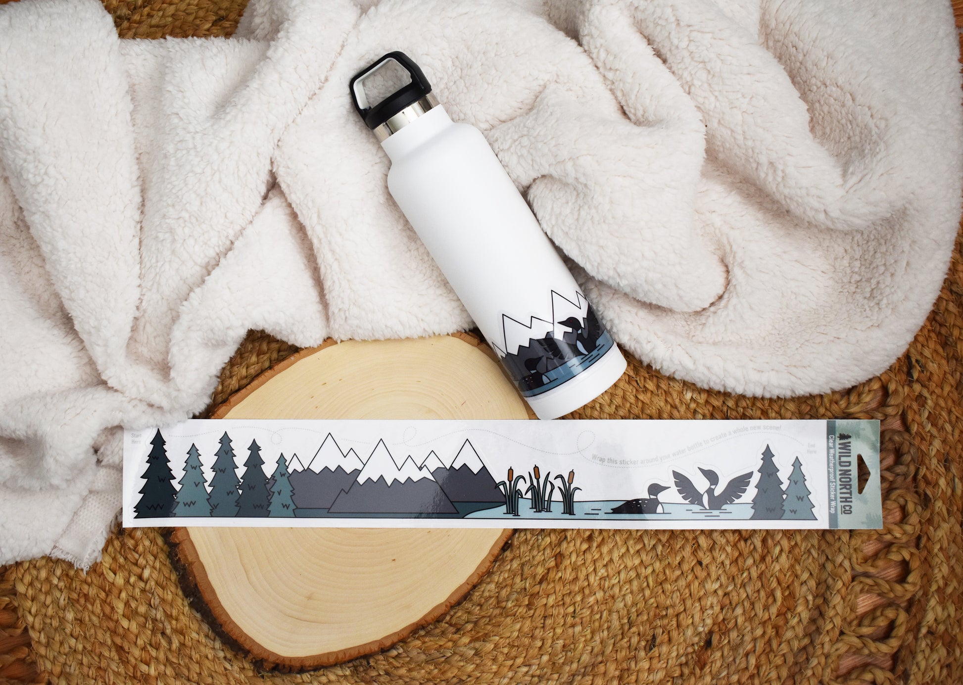 This loon lake sticker was designed to wrap the entire way around any size bottle up to 1/2 gallon! As you place the sticker around the bottle it will overlap and create an epic lake scene complete with trees and mountains in the background!